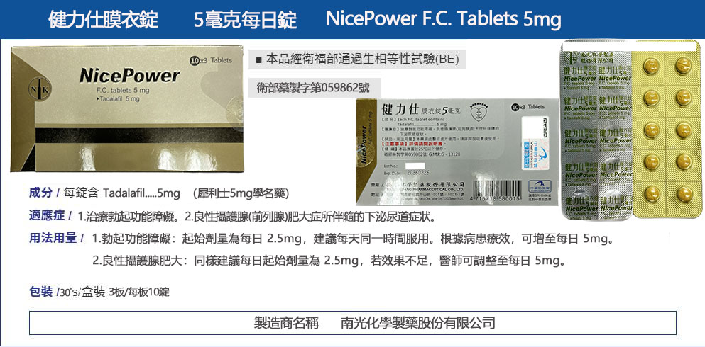 商品名稱:健力仕膜衣錠 NicePower 5mg