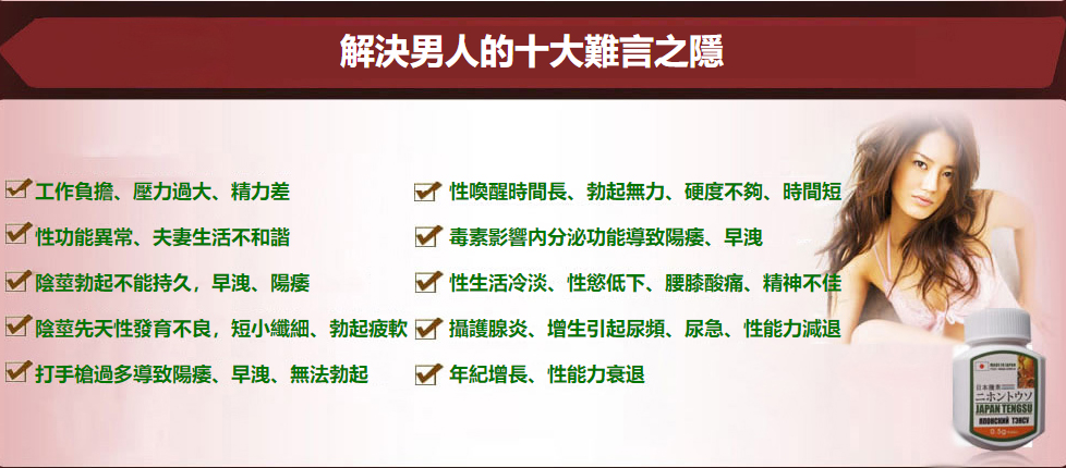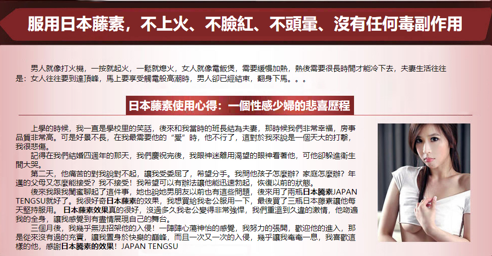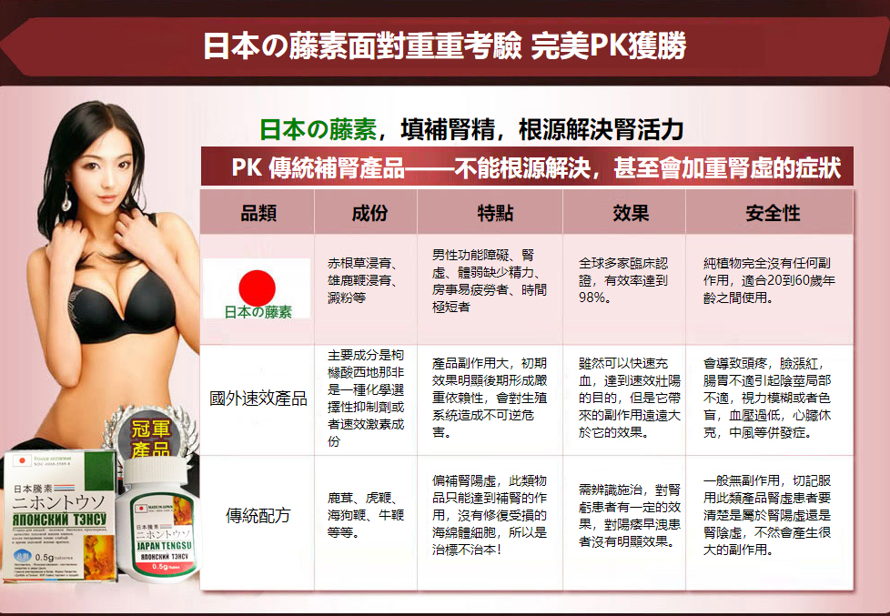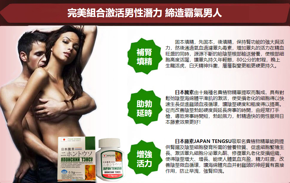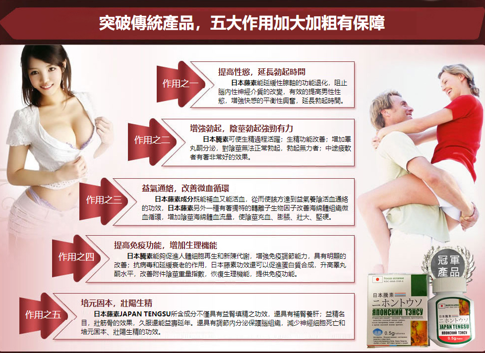 日本藤素是唯一的一種100%純天然,安全,有效的男性功能藥物,它可以解決男人性生活中的尷尬難題。隻有日本藤素可以帶給男性朋友更多的男性魅力,性能力,和性是快感,而且完全沒有任何健康風險,並且不需要醫生處方。這是因為日本藤素結合了天然成分和被臨床證明有效的濃度值,從而最大程度提高了您的性慾和性能力。